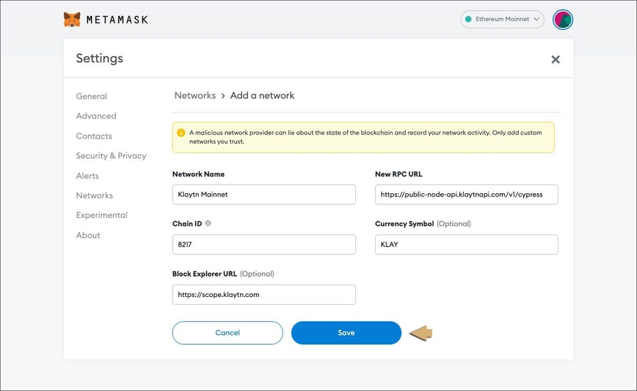 Network Name: Klaytn Mainnet New RPC URL: https://public-node-api.klaytnapi.com/v1/cypressarrow-up-right Chain ID: 8217 Currency Symbol: KLAY Block Explorer URL: https://scope.klaytn.comarrow-up-right